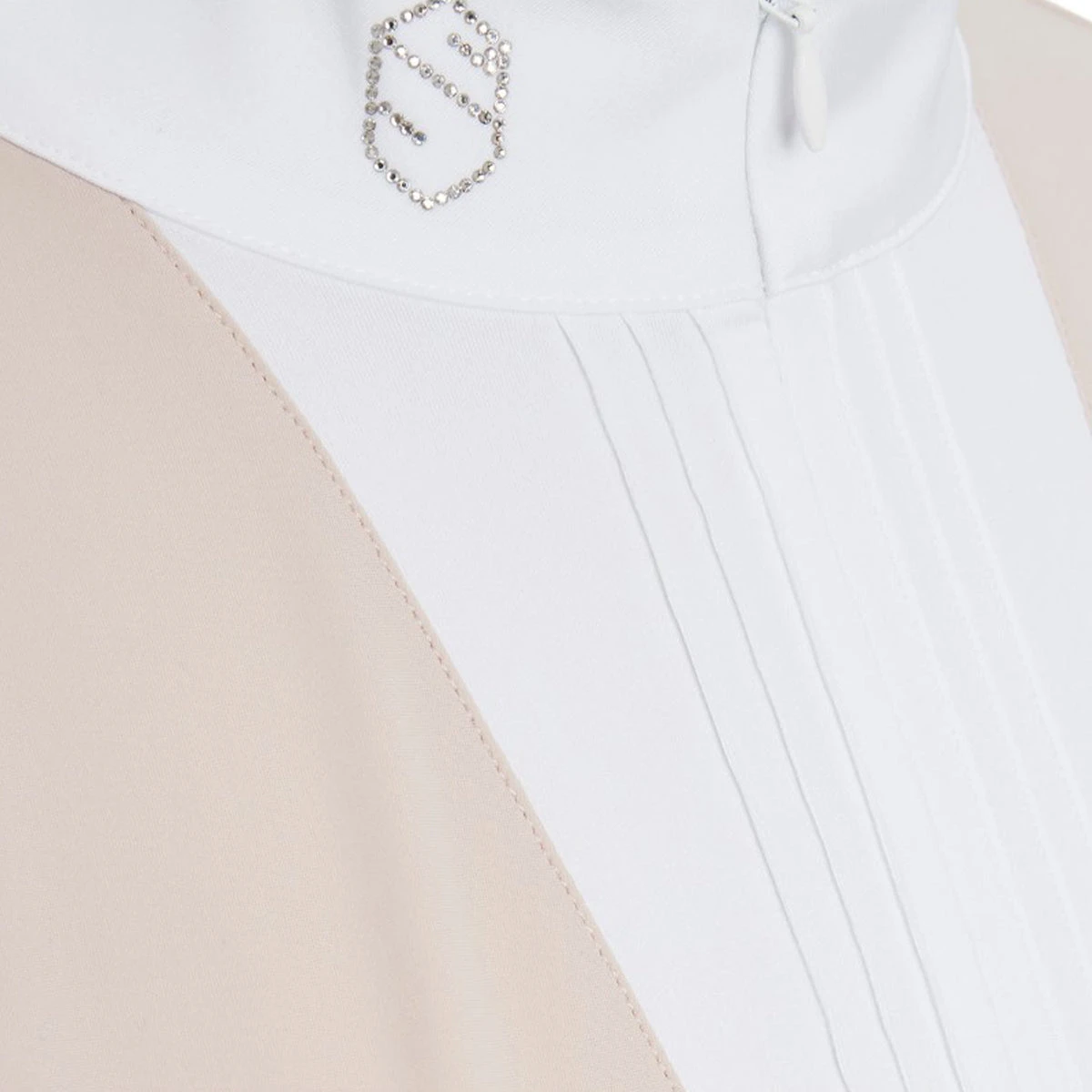 The Womens Clarisse Short Sleeve Show Shirt features a thin pleated bib, shaped perfectly to sit in line with the competition jacket. An invisible zipper gives ease of use to the wearer, whilst the Swarovski Samshield blazon on the collar and delicate teardrop opening on the reverse add to the feminine feel of this garment. The material is a high stretch, breathable, technological fabric that wicks away sweat to keep the rider dry and comfortable and UV protection maintains the quality of the fabric and protects the riders skin in the summer months. Easy care, machine washable at 30’C and made in an eco conscientious manner.